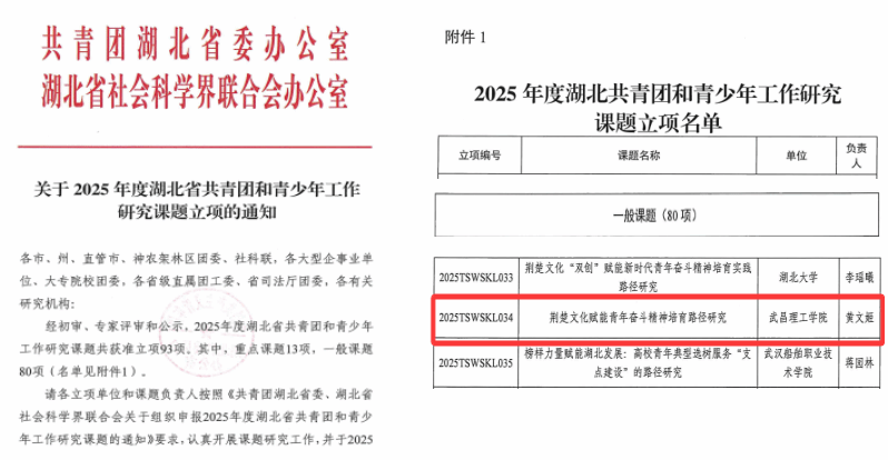 304永利集团登录入口获2025年度湖北省共青团和青少年工作研究课题立项