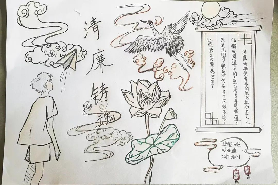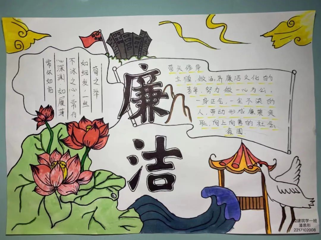 “粉身碎骨浑不怕,要留清白在人间”。同学们的作品切实展现了清廉的重要特性,是一种清清白白的行为和光明磊落的态度。通过本次活动,同学们认识到廉洁是大学生采纳阳光、驱散黑暗的道德所向,也是大学生在复杂的社会环境中保持道德人格的关键,对同学们的成长具有重要里程碑作用。