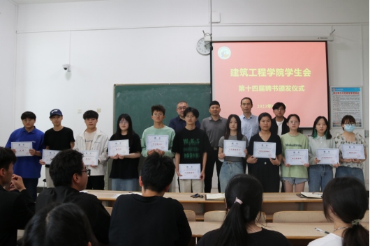 仪式开始前,侯义飞对第十四届学生会干部的过往工作予以肯定与表扬,同时倡导各位学生会成员以他们为榜样将学生会发扬光大。随后,孔祥伟和杨凯为第十四届学生会骨干成员颁发聘书,并合影留念。