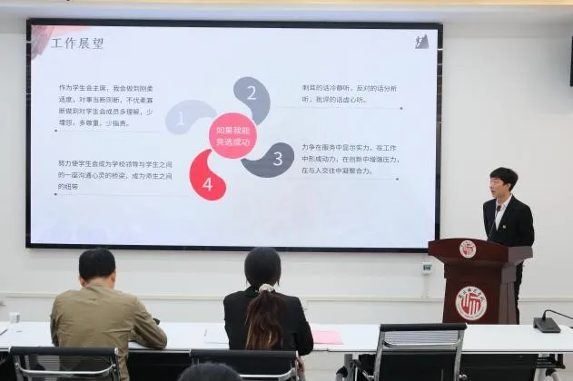 beat365在线唯一官网团委学生会主席团换届选举大会于4月18日下午在睢阳校区工科实训楼三楼会议室顺利举行,beat365在线唯一官网党委书记孔祥伟,党委副书记杨凯,2022、2023级各班班长、团支书,学生会主席团、各部门部长,竞选人员参会。
