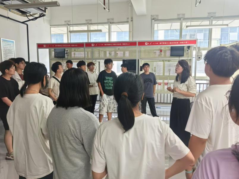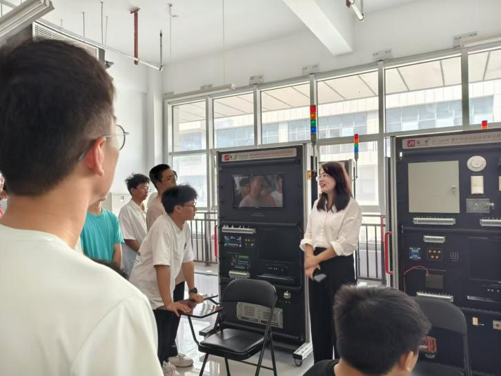 戚瑷娜带领同学们参观楼宇智能化工程实训系统。实训装置模拟了实际的建筑场景,为学生提供了接近工程现场的实训环境。同时向同学们介绍了楼宇智能化设备监控系统,让他们了解先进的传感器技术、自动化控制技术和通信技术是如何实现对楼宇设备的实时监测、控制和优化管理的。