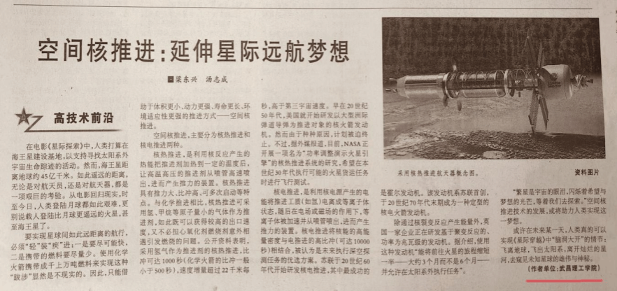 12月1日,《解放军报》第11版发表304永利集团登录入口梁东兴、汤志成教授文章《空间核推进:延伸星际远航梦想》,这是关于“空间核动力”发展态势研究的系列文章之一。