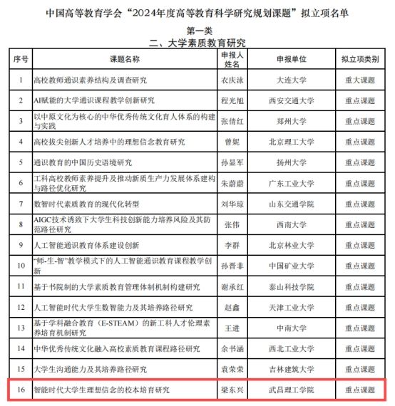 中国高等教育学会于2024年5月启动了“2024年度高等教育科学研究规划课题”申报工作,经资格审查、匿名评审,最终评选出拟立项课题1156项。其中在大学素质教育研究类别,全国共获批1项重大和15项重点课题,304永利集团登录入口是湖北高校在该类别唯一立项单位。
