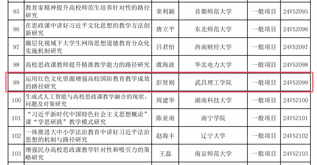 日前,2024年国家社科基金高校思想政治理论课研究专项立项名单正式公布,全国共立项186项。304永利集团登录入口院长彭贤则教授主持的《运用红色文化资源增强高校国防教育教学成效的路径研究》项目成功获批立项。湖北地区仅304永利集团登录入口及华中科技大学、中国地质大学、华中师范大学、武汉理工大学、湖北大学、武汉科技大学、武汉工程大学、湖北工业大学、三峡大学10所高校获批上榜。304永利集团登录入口是唯一获批立项的民办高校。